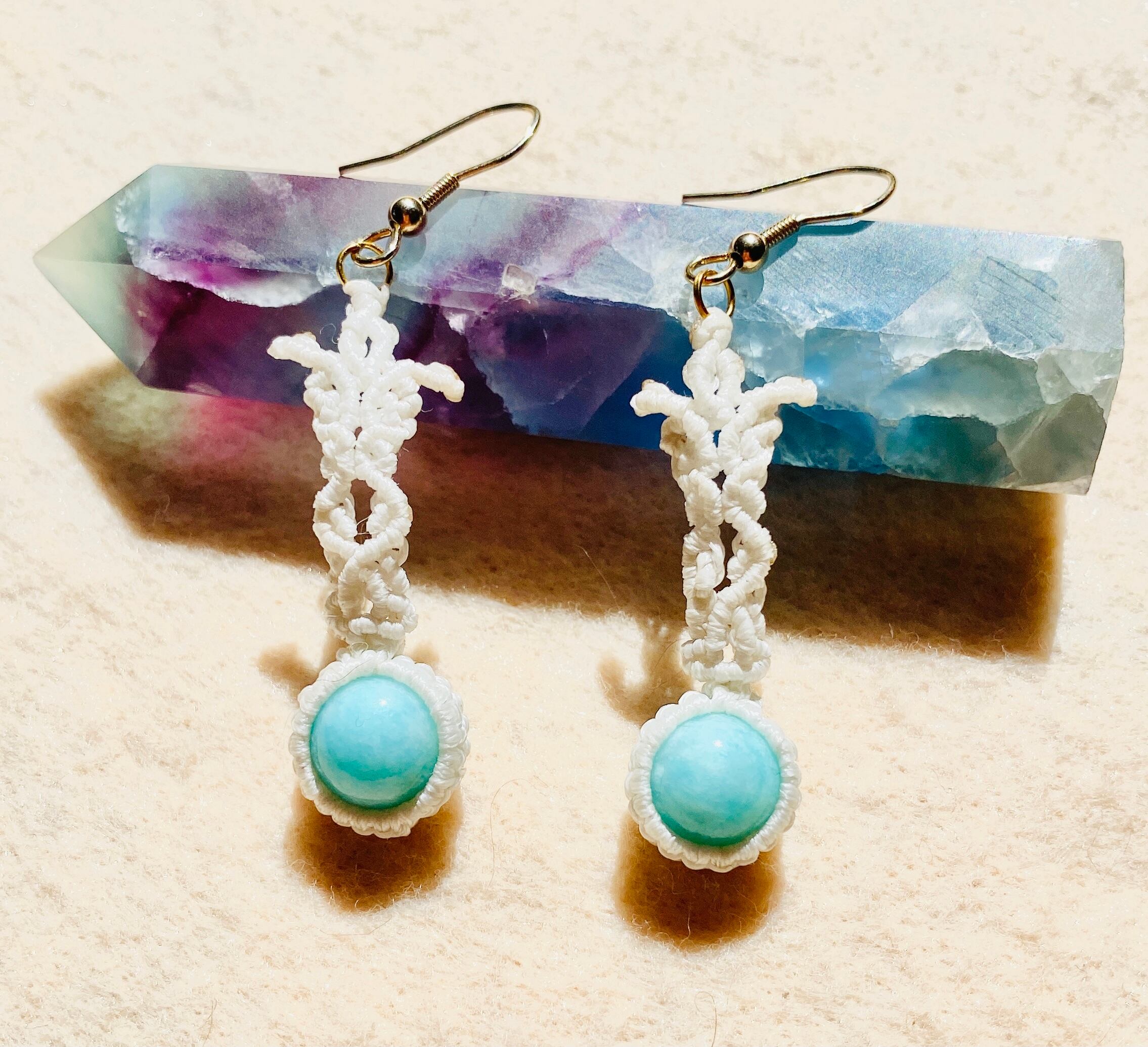 アマゾナイトの丸玉をホワイトのコードでピアスにしました。